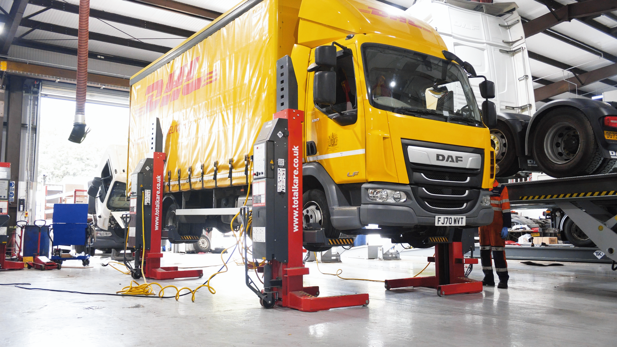 The Y-MECH lift from Totalkare provides exceptional lifting capacity and stability for HGVs, making it ideal for workshops seeking a permanent lifting solution. Paired with a heavy-duty jacking beam, it enables wheels-free maintenance, greatly enhancing operational flexibility. In addition, the T8AC cabled mobile column lifts bring added versatility, allowing the team at Greenhous DAF to lift a variety of vehicles in different workshop locations with ease.