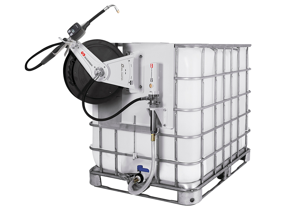 - 3:1 ratio side mounted oil pump package for 1000 litre IBC with 10m x 1/2" single arm hose reel.