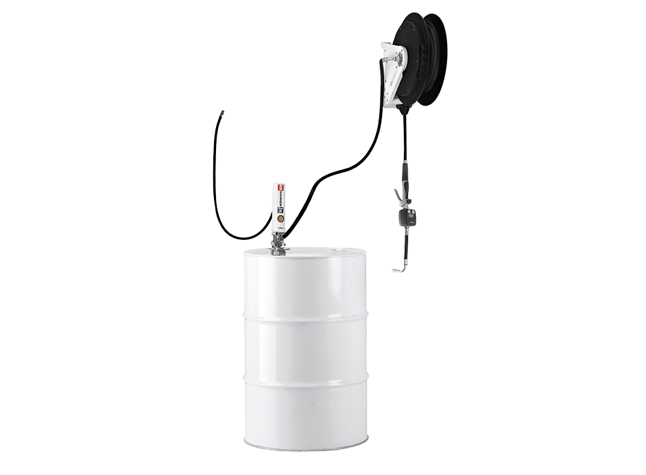- 3:1 Ratio Drum Bung Mounted Oil Pump Package for 205 Litre Drum with 10m x 1/2" Single Arm Hose Reel